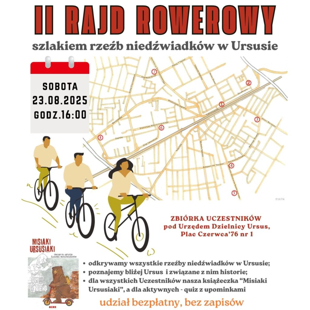 Zapraszamy do wzięcia udziału w drugim Rajdzie rowerowym szlakiem rzeźb niedźwiadków w Ursusie. Z naszą przewodniczką – „panią misiową” – Agnieszką Bińczycką z Domu Kultury „Portiernia” oraz Agnieszką Gorzkowską z Izby Tożsamości Ursusa. Usłyszymy szczegóły związane z realizacją zwycięskiego projektu w ramach Budżetu Obywatelskiego na 2024 rok „Ursusiaki – rzeźby niedźwiadków w Ursusie”.