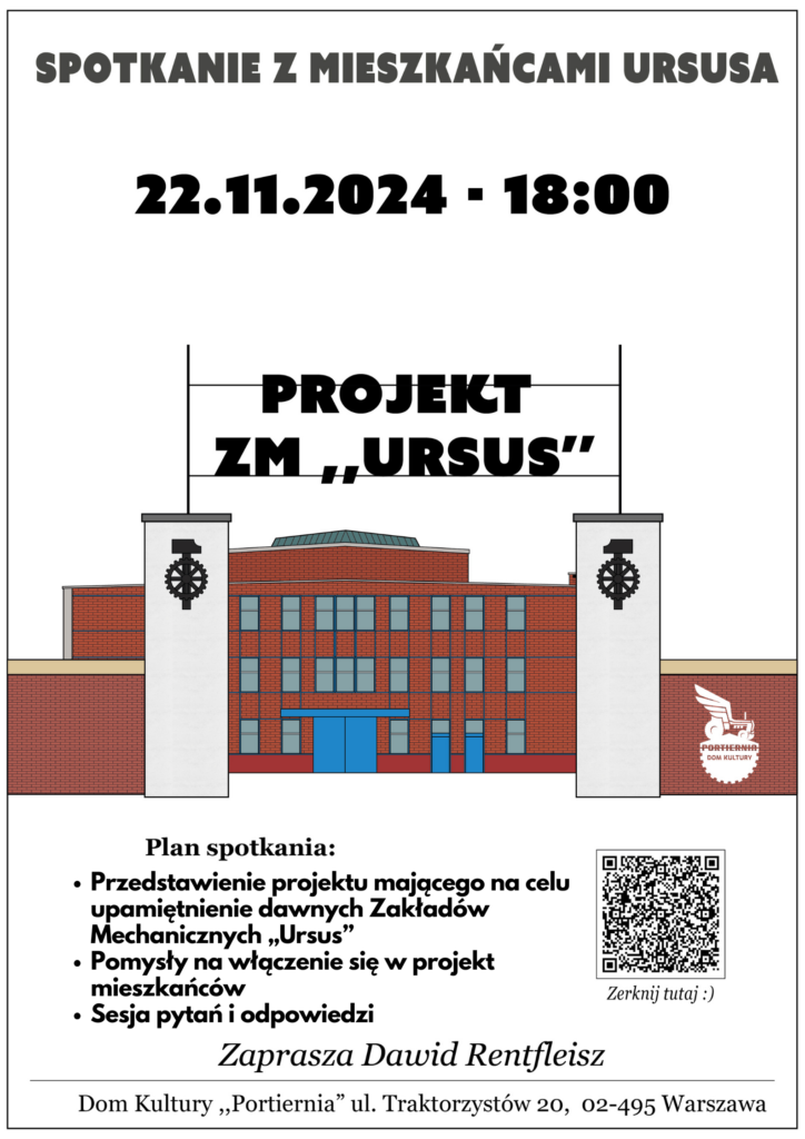 Zapraszamy serdecznie na rozmowę o projekcie dotyczącym dawnych Zakładów Mechanicznych „Ursus”. Spotkanie poprowadzi Dawid Rentfleisz, autor projektu, który wciąż jest w fazie tworzenia. Na pewno nieoceniona i potrzebna będzie pomoc mieszkańców, którzy mogą włączyć się w przedsięwzięcie i ułatwić jego finalizację. Spotkanie odbędzie się w Domu Kultury „Portiernia” w piątek, 22 listopada o godz. 18:00 w kawiarence na 1. piętrze