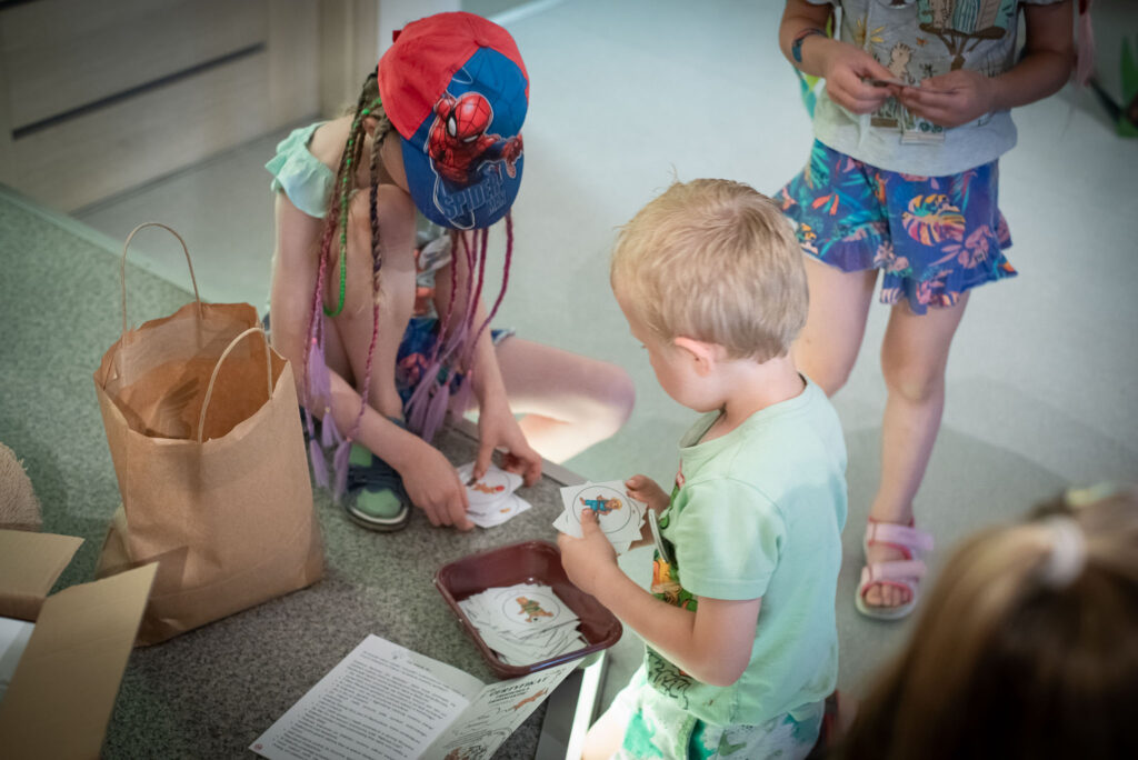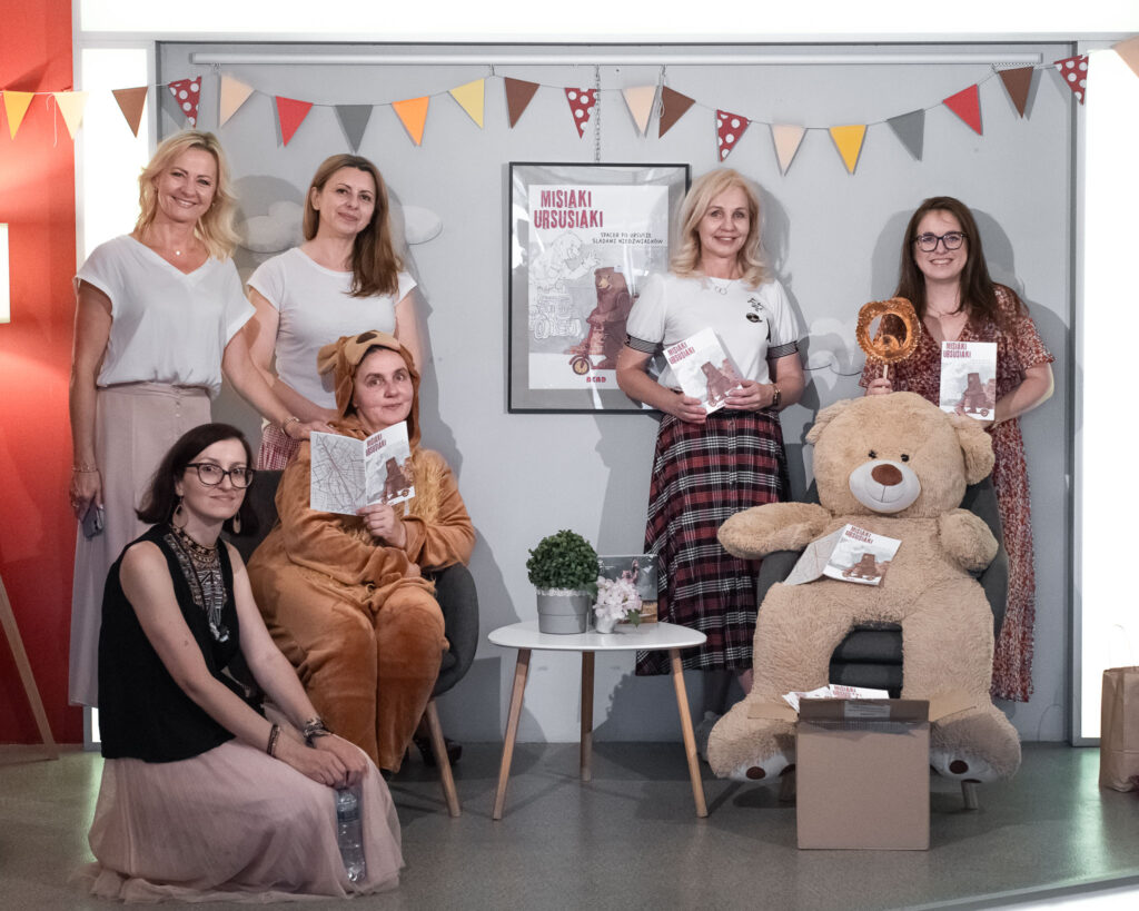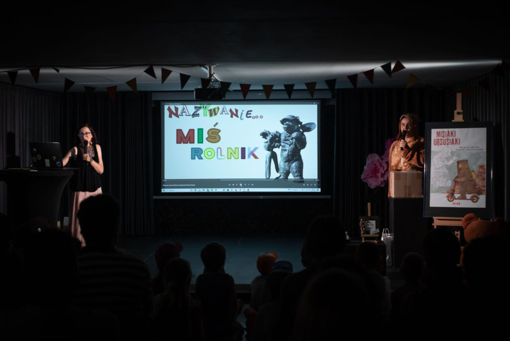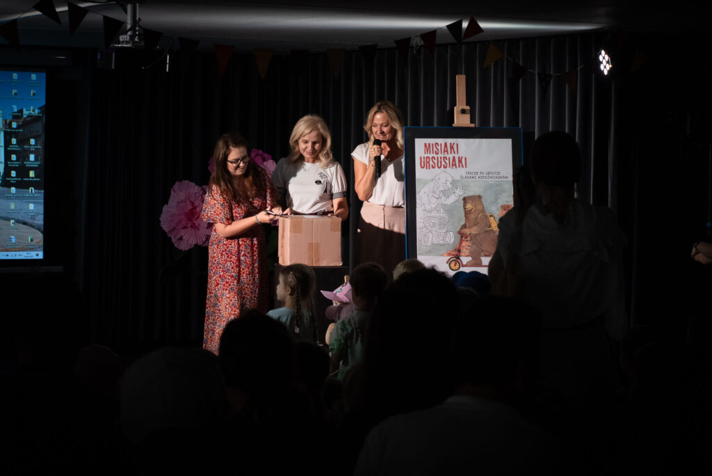 Reszta atrakcji czekała na uczestników w Domu Kultury „Portiernia”. Rozpoczęliśmy od prezentacji na 1. piętrze i przybliżyliśmy historię powstania Misiaków Ursusiaków. Przedstawiliśmy wszystkie misie i uroczyście otworzyliśmy paczkę z naszymi książeczkami.